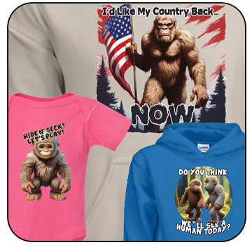 If You Love The Hunt For Bigfoot and Other Cryptids, You Will Love What You Find Here! We Offer A Wide Variety Of Sizes and Colors of T-Shirts, Hoodies for Adults and Kids Plus We Have Infant Wear.